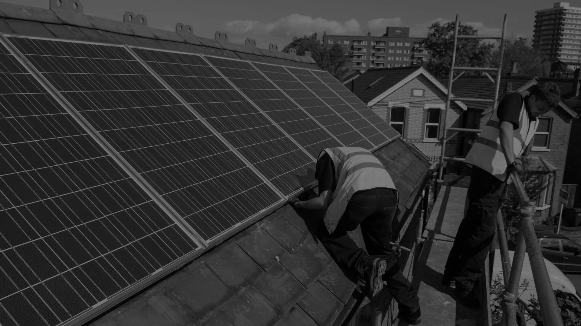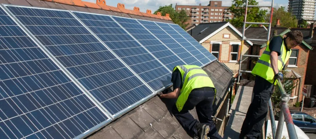 Workers install photovoltaic solar panels on the slate roof of a Victorian house in London, England.